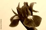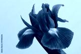 Close-up Violet, blue, yellow Iris Flower on beige gray. Minimalist still life. Natural background.