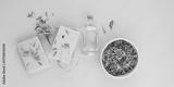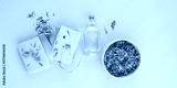 Flatlay of handmade soap bars with dried calendula petals, marigold flower, herbal oil bottle and ceramic bowl on pastel background