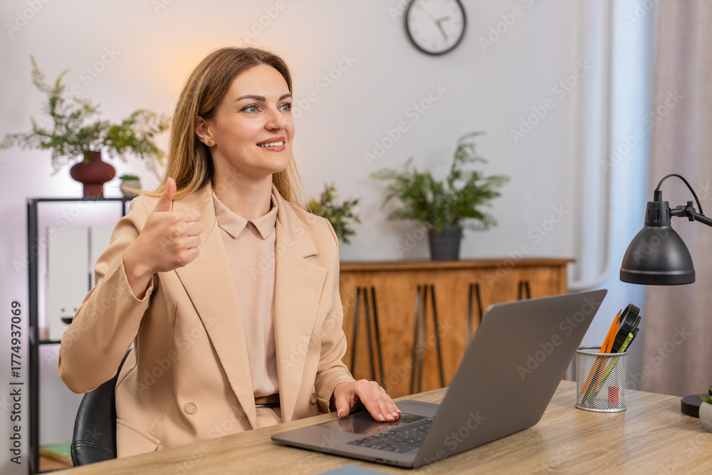 Middle-aged businesswoman at home office checks results on laptop smiles shows thumbs up gesture approves work. Freelancer girl at table confirms success sends file writes note celebrate progress