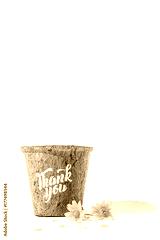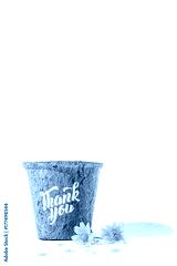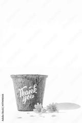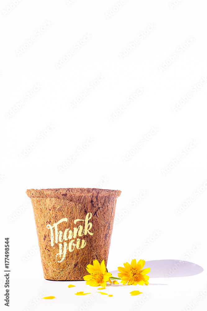 Give Thank you calligraphy on flowerpot with yellow blossoms isolated on white background. Free space for your own text for special day or holiday. Thankful concept,Thank giving day