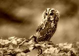 Tawny owl ( Strix aluco ) sitiing in the autumn forest