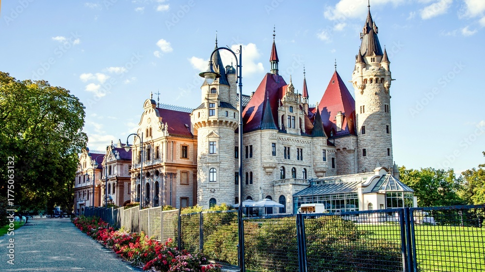 Fairy-tale Moszna Castle in Poland during autumn, historic architecture and park.