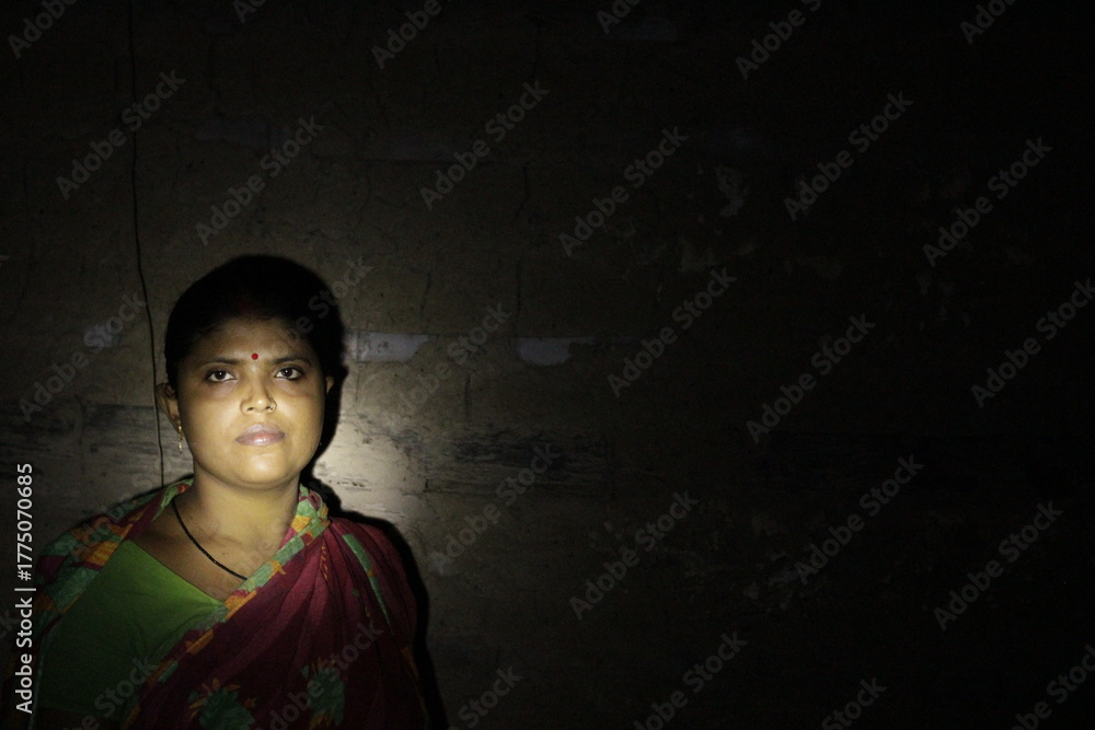 A calm woman smiles in dim light, representing the spirit of perseverance, simplicity, and strength of Indian women who shine quietly amid life’s everyday challenges.