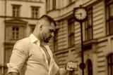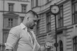 Man checks his watch and check schedule. Man rushes and checks his watch. Guy man with wristwatch.