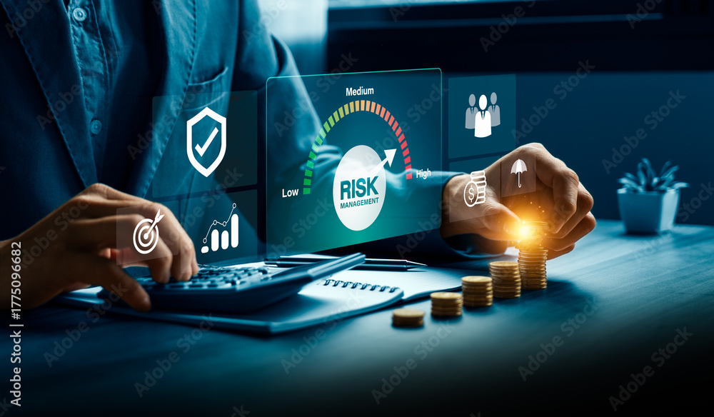 Risk management and financial strategy concept with businessman analyzing investment data and protecting assets, using calculator, digital dashboard to evaluate low, medium, high business risk levels