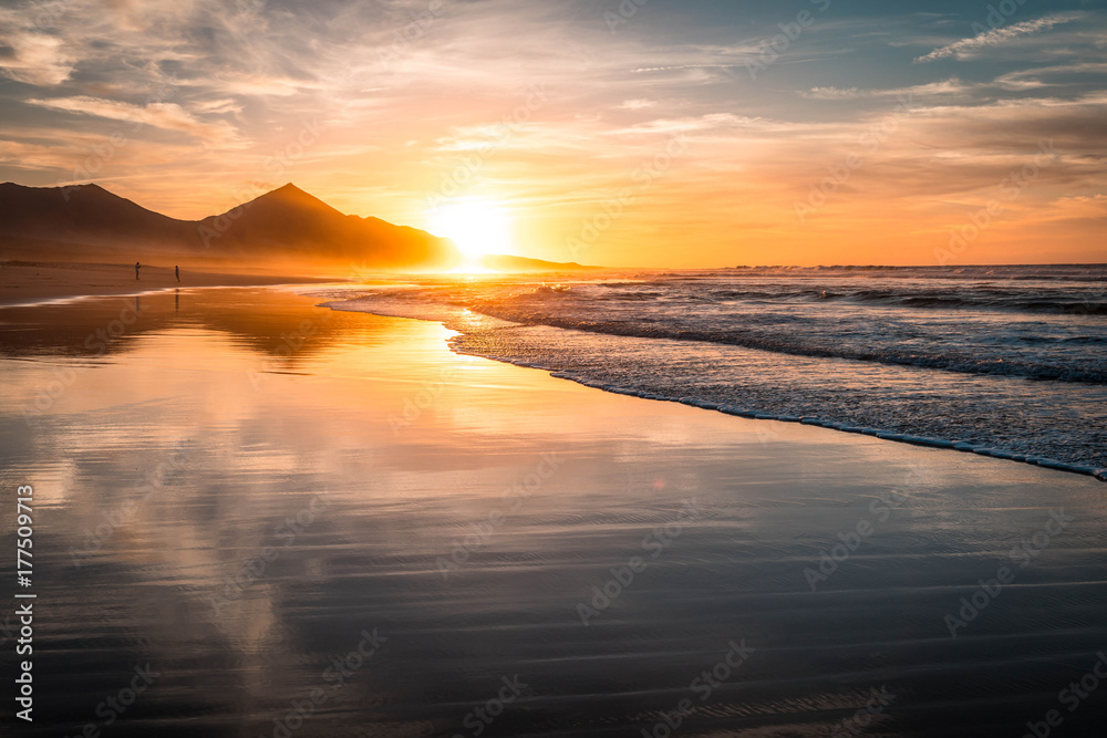 Amazing beach sunset with endless horizon and hills, reflection in the background