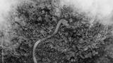Aerial view of a winding road curving through lush green tropical forest with misty atmosphere. Scenic mountain highway surrounded by dense jungle and natural landscape.