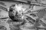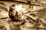Global finance concept showing world economy and foreign exchange market with currency symbols dollar euro yen and pound on money background representing international trade and investment growth.