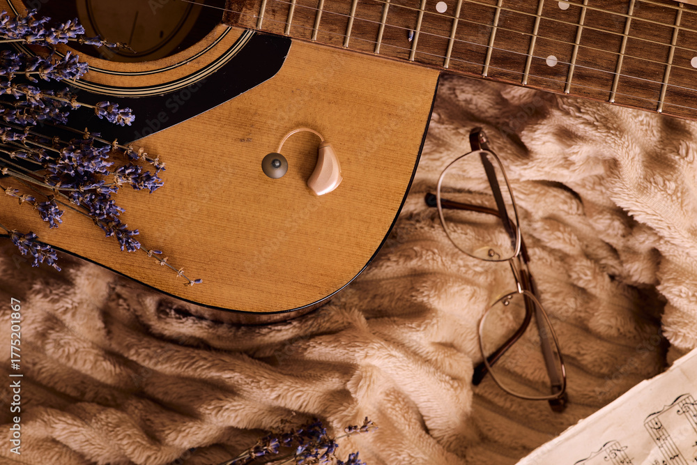 BTE hearing aid rests on an acoustic guitar, surrounded by lavender and glasses, evoking warmth and connection. Hearing health