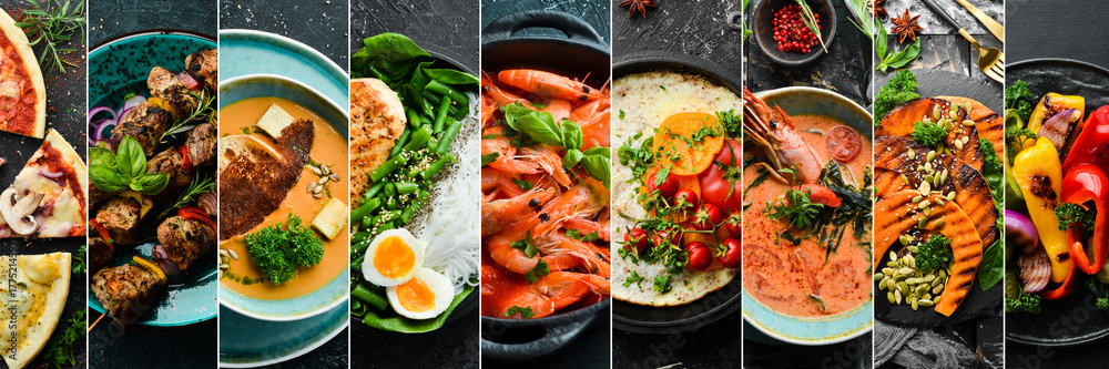 Assortment of cooked food. Collage food in plates, top view. Place for your text, banner of food, menu. Varied food.