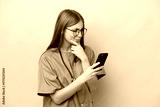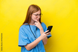 Young redhead nurse woman isolated on yellow background thinking and sending a message
