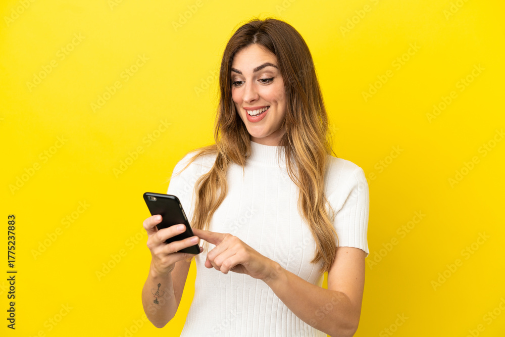 Caucasian woman isolated on yellow background sending a message or email with the mobile