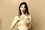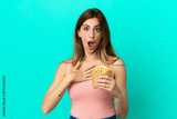 Caucasian woman holding fried chips isolated on blue background surprised and shocked while looking right