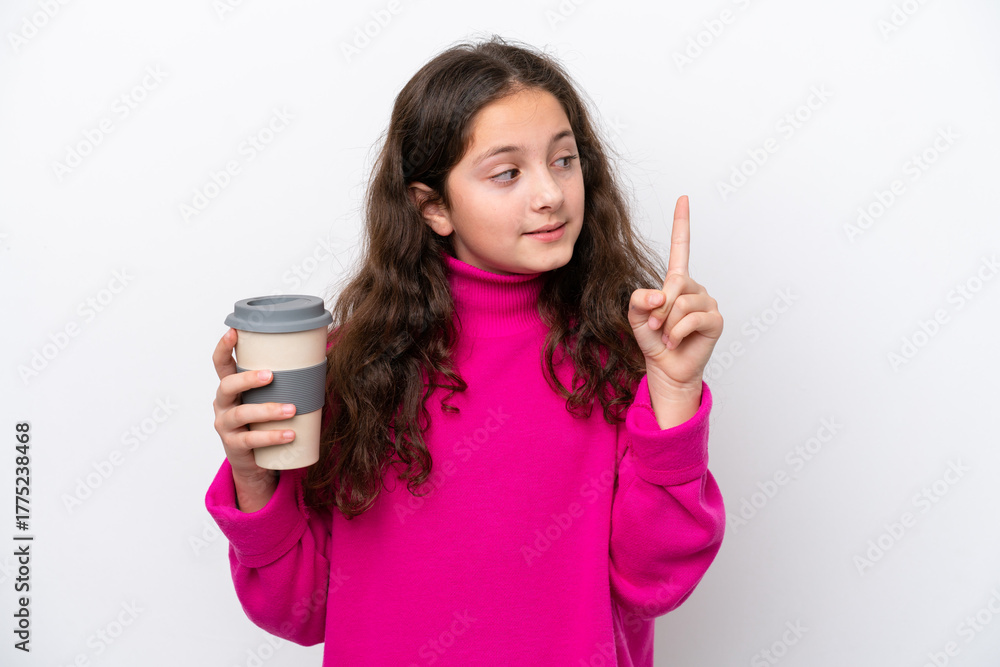 Little caucasian girl holding a take away coffee isolated on white background intending to realizes the solution while lifting a finger up