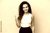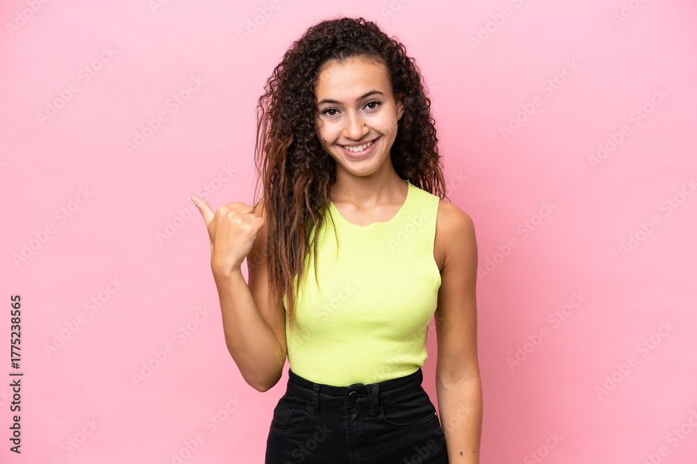 Young hispanic woman isolated on pink background pointing to the side to present a product