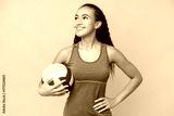 Young woman playing volleyball isolated on yellow background posing with arms at hip and smiling