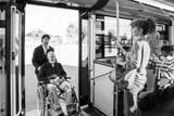 Young man assisting a senior individual in a wheelchair getting onto a public transport bus, showing urban accessibility