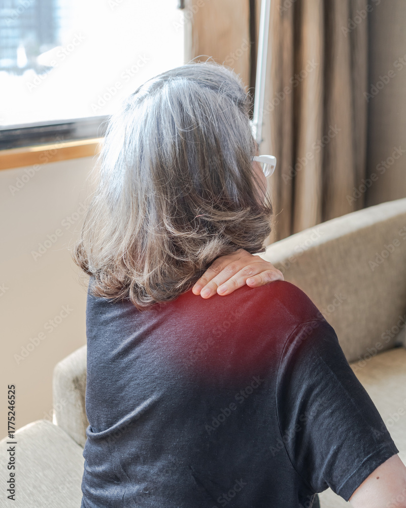 Shoulder pain, frozen shoulder (Adhesive Capsulitis), muscle strain, tendon rupture, osteoarthritis, or rheumatoid arthritis in menopause elder Asian woman or aged elderly senior