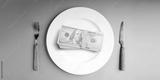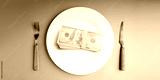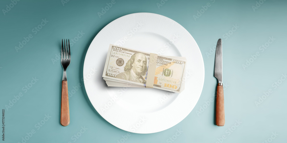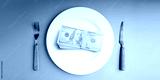 Money served on a plate with cutlery symbolizes capitalism. Table Top View