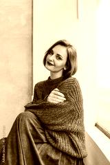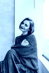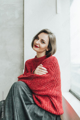 Young female in red knitted sweater embracing herself by bright window backdrop