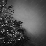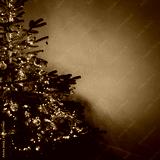 Christmas tree decorated with toys and warm garland lights on tan brown wall. Aesthetic Christmas, New Year, winter holidays composition