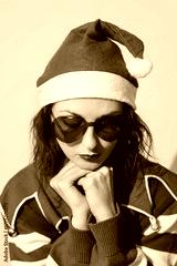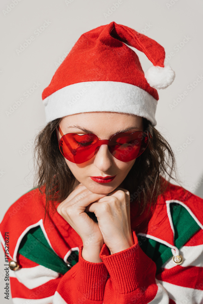 Female Santa helper in red and green costume posing thoughtfully with sunglasses