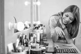 Beautiful young woman choosing beauty products for makeup.