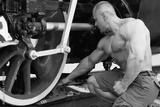 athlete puts brake boot under locomotive wheel