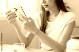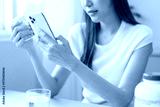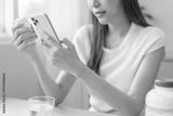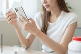 Health care asian young woman using smart phone for reading, searching prescription on bottle medicine, pill label text about information online, instructions side effects, pharmacy medicament concept