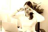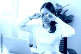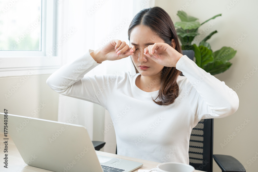 Tired asian young woman burnout, stressed from problem work at desk in office, looking at laptop computer, feeling sick, pain eye strain rubbing dry irritated eyes fatigued working late on deadline.