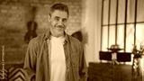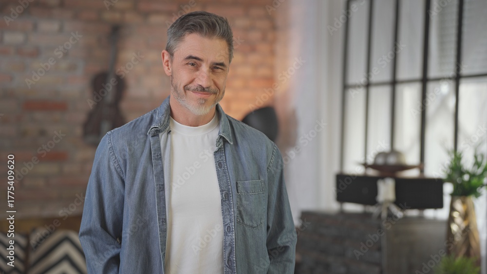 Portrait of happy casual middle aged man standing at home in loft living room. Senior male with grey hair in denim shirt looking at camera, smiling.