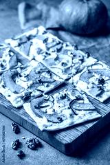 Tarte flambee with pumpkin, red onions, sheep's cheese and walnuts on a gray background