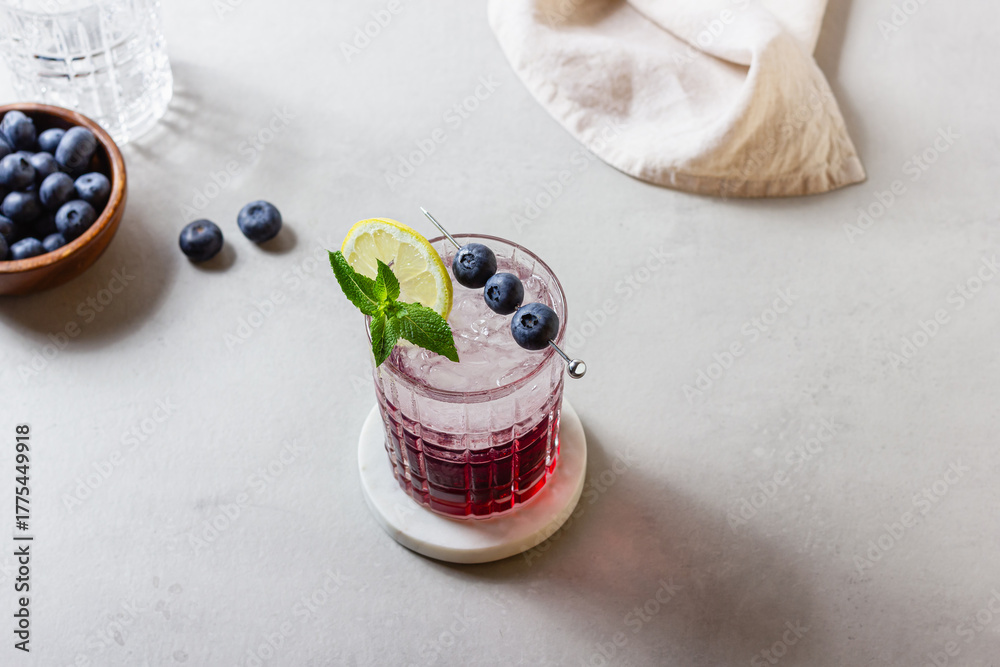 Summer fresh blueberry cocktail with ice, lemon and mint