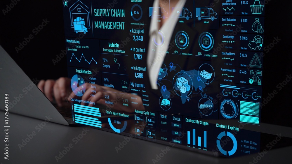Supply chain management interface showing delivery routes, warehouse efficiency, cost savings, vehicle tracking, procurement ROI, and contract stages. Futuristic supply chain monitoring system. Thunk