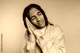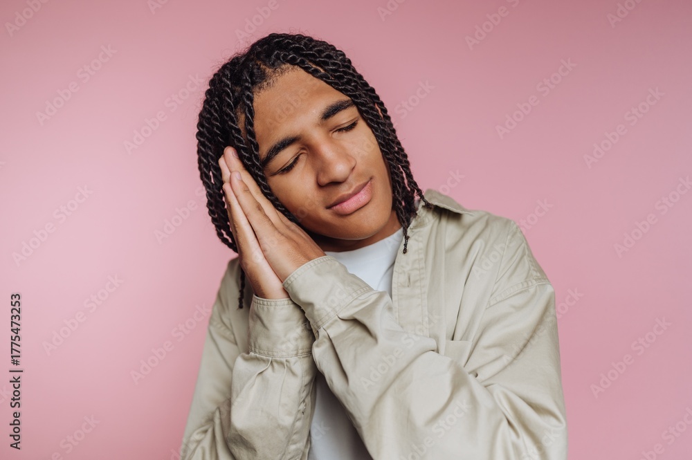Young Man Mimicking Sleep on Pink Background