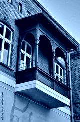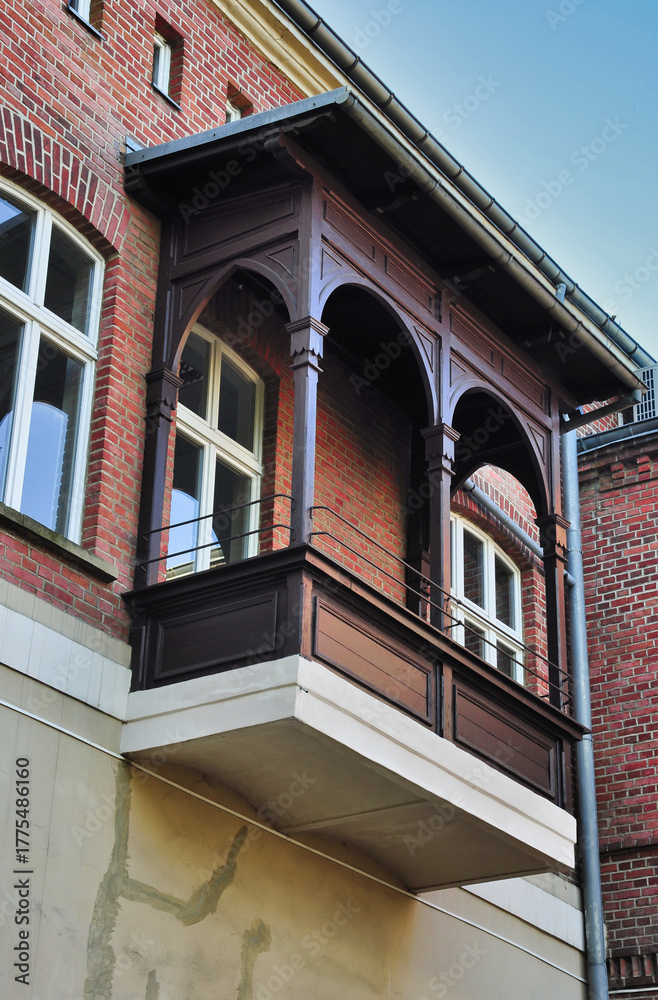 Zabytkowy drewniany balkon z łukowymi otworami nad zewnętrzną częścią ceglanego budynku.