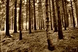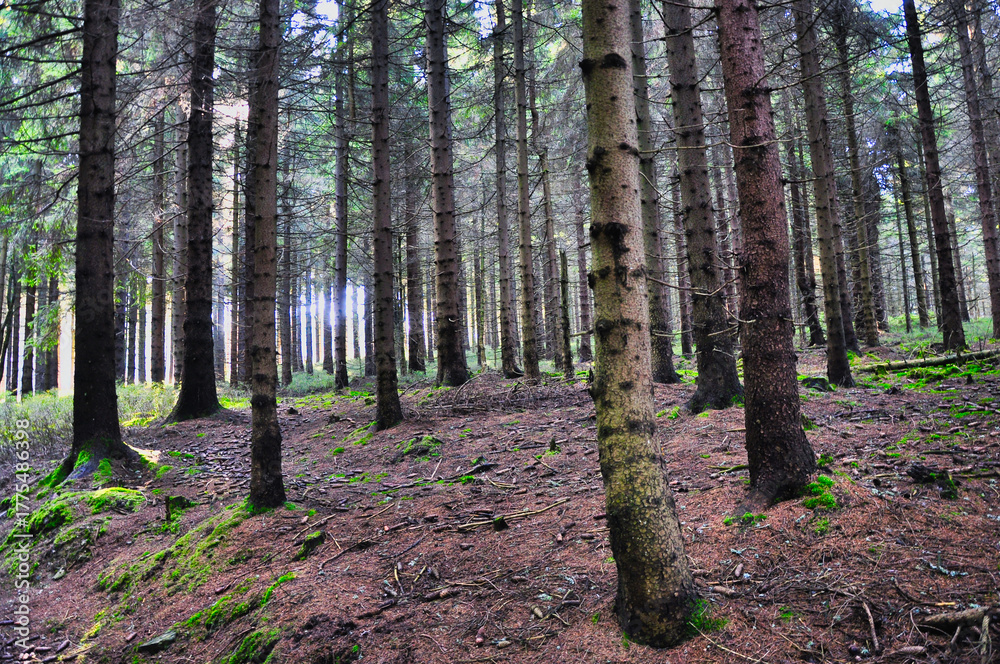 Oświetlona słońcem panorama górskiego lasu świerkowego z podszytem i szyszkami na ziemi. Spokojny widok natury lasu.
