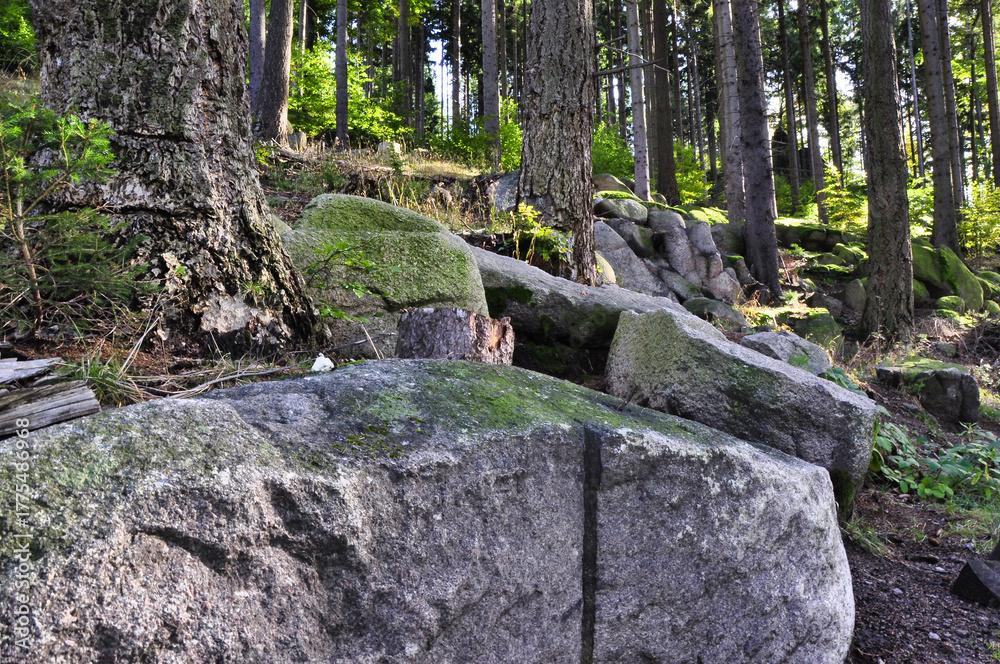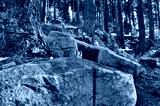 Spokojny leśny krajobraz z dużymi, pokrytymi mchem głazami rozrzuconymi wśród potężnych sosen.