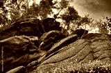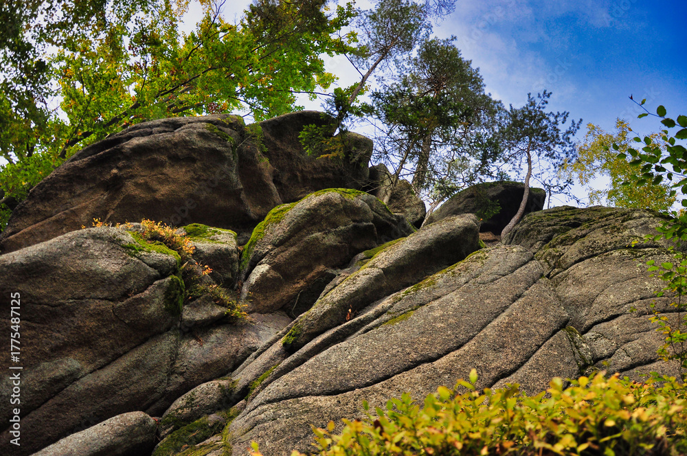 Rudawy Janowickie – Strużnickie Skały. Surowa formacja skalna na leśnym klifie pod błękitnym niebem z omszałymi głazami.
