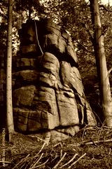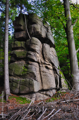 Rudawy Janowickie – Strużnickie Skały.Majestatyczne kamienne monolity otoczone zielonym lasem, mchem i opadłymi gałęziami w spokojnej okolicy.