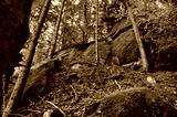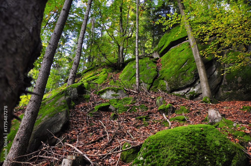Rudawy Janowickie – Strużnickie Skały. Omszała ściana skały leśnej z pochyłym szlakiem i jesiennymi liśćmi w spokojnym lesie.
