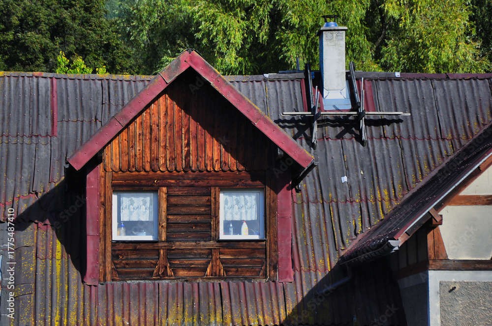 Rustykalna, drewniana lukarna wisi na spadzistym dachu, obramowanym czerwoną lamówką.