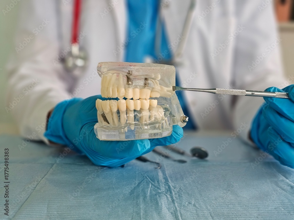 Dentist demonstrating dental care with a model while wearing gloves and a medical coat in a clinic