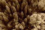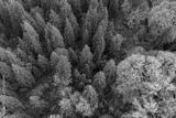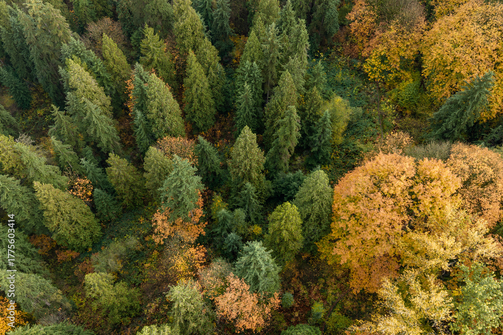 Aerial View Of Autumn Forest With Green Conifers And Golden Deciduous Canopy From Above