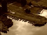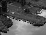 Widok z lotu ptaka na przystań z łódkami nad Zbiornikiem Kozłowa Góra (Jezioro Świerklaniec) o zachodzie słońca