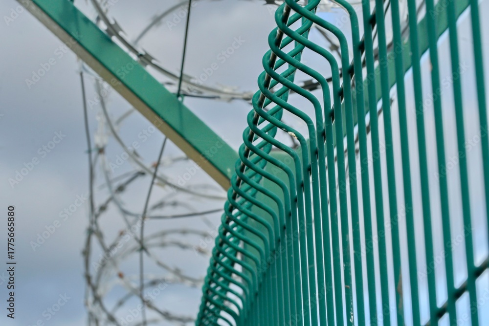 Barbed razor wire on a high-security building. Barbed wire and hard wire fence. Concepts for jails, army facilities, nuclear power plants, and defense against illegal migration.