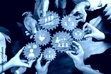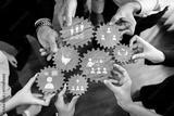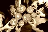 Hands unite around wooden gears, symbolizing collaboration and shared ideas in a modern business setting. This image showcases teamwork and strategy for success. Amity