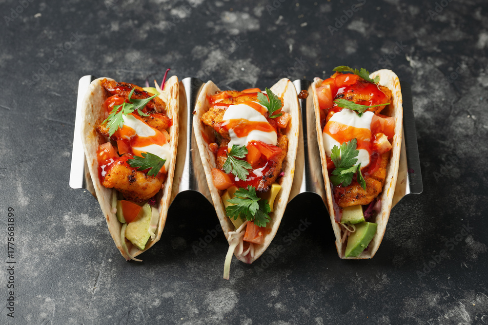 Mexican Fish Tacos with fresh vegetables, sour cream and chilli sauce