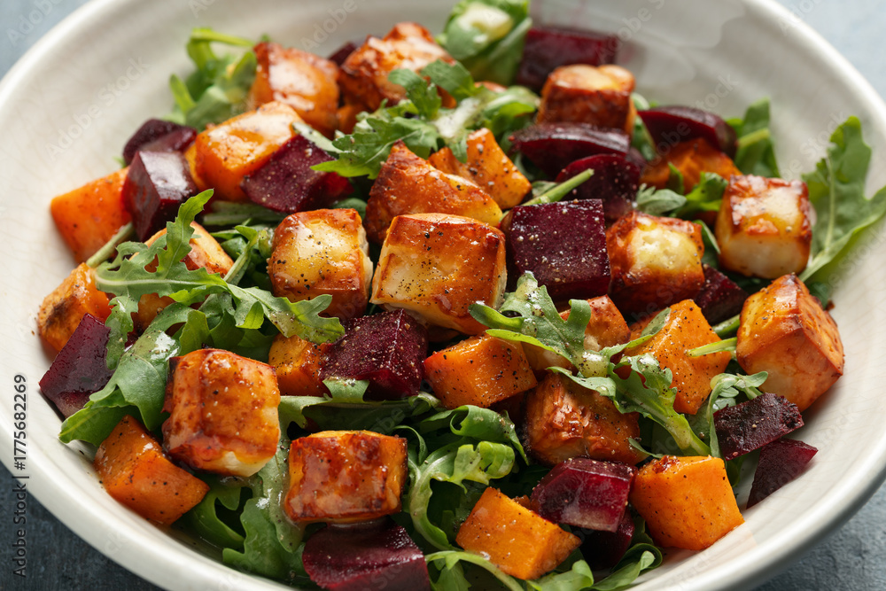 Halloumi, Sweet Potato, Beet Salad. Healthy Food.