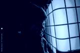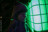 Little boy wearing warm hat and jacket looking at glowing green light cube in night setting, playful expression and face paint showing fascination with colorful illumination in city event